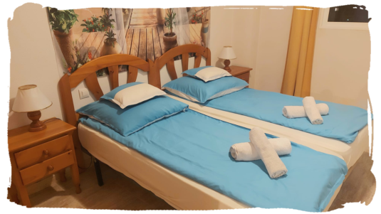 A hálószobában 2 db 90 cm széles egyszemélyes ágy került elhelyezésre, míg a nappaliban egy kényelmes, 150 x 200 cm-esre nyitható  kanapéágy van.